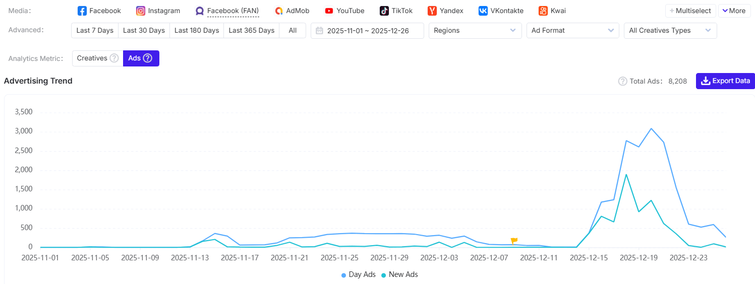 According to AppGrowing, Where Winds Meet launched a total of 8,766 ads across 26 regions and 14 media platforms from November 1, 2025, to December 26, 2025.