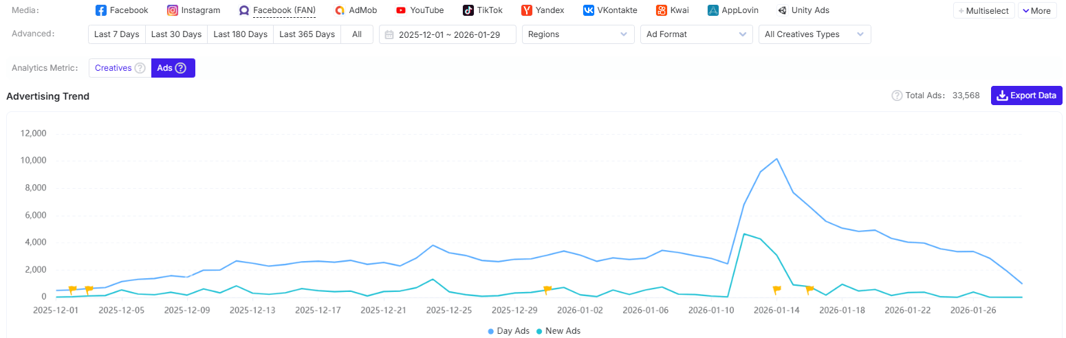A single-day peak of 10,189 ads occurred on 2026-01-14. Likely tied to a paid push tied to an in-game event, patch release, marketing promotion, or a planned burst to secure chart momentum after initial launch. Peaks often align with cross-channel campaign starts or extra budgets for regional blitzes.