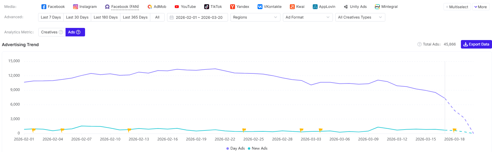 According to AppGrowing, Tasty Travels launched a total of 45,866 ads across 87 regions and 16 media platforms from February 1, 2026, to March 20, 2026.