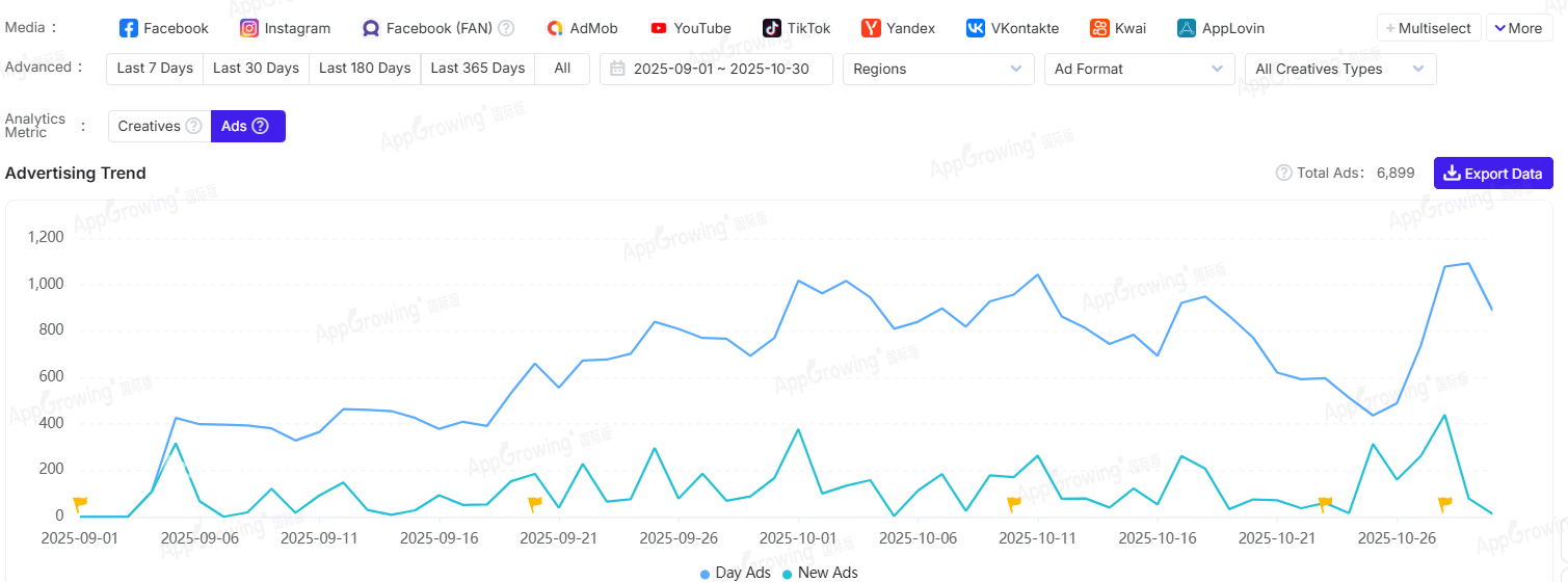 Large-scale advertising began in mid-September, roughly four weeks ahead of launch. Initial campaigns remained modest, with daily volumes below 500 creatives.