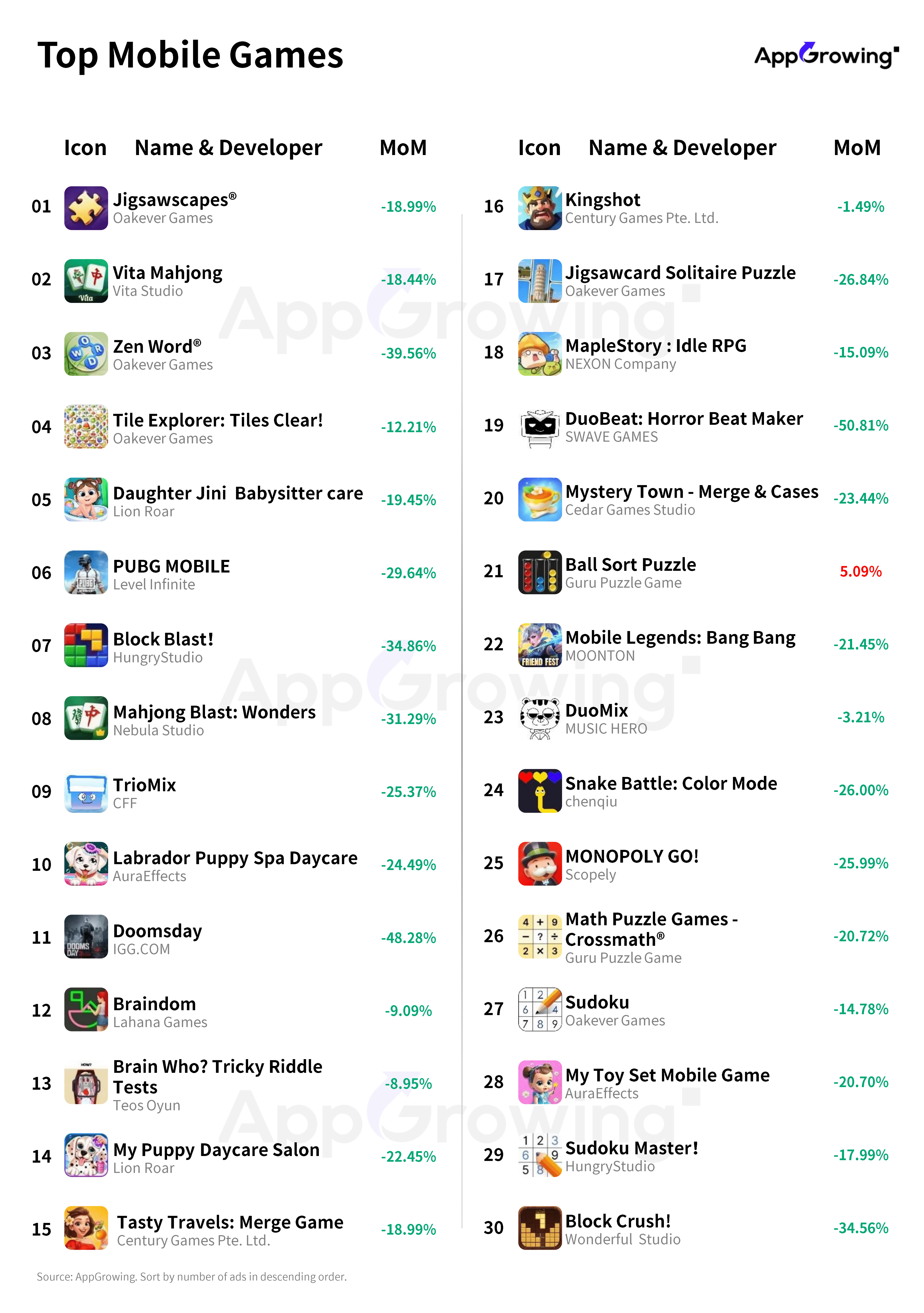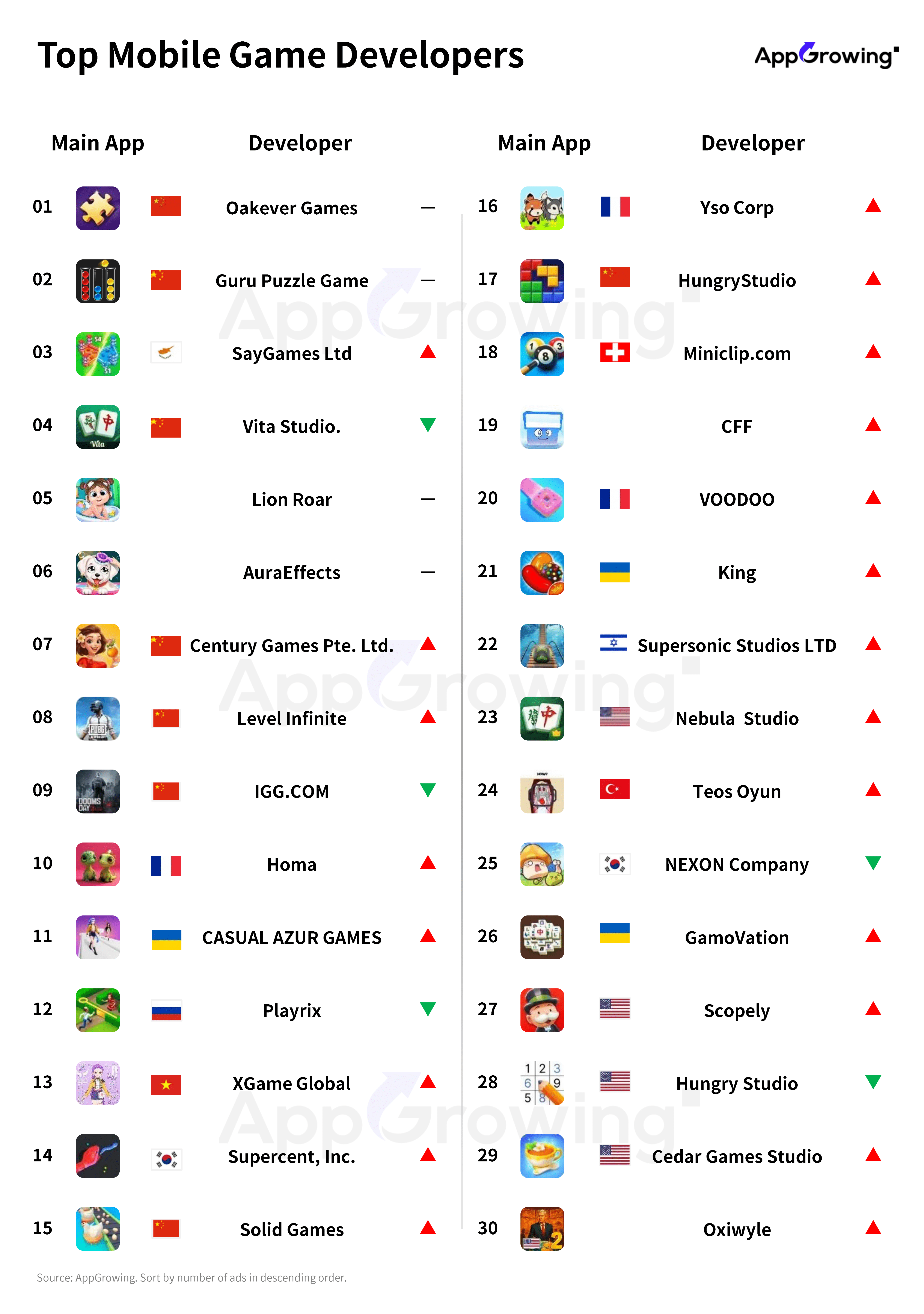 According to AppGrowing, the top three developers by ad volume were Oakever Games, Guru Puzzle Game, and SayGames Ltd, Vita Studio slipped to fourth.