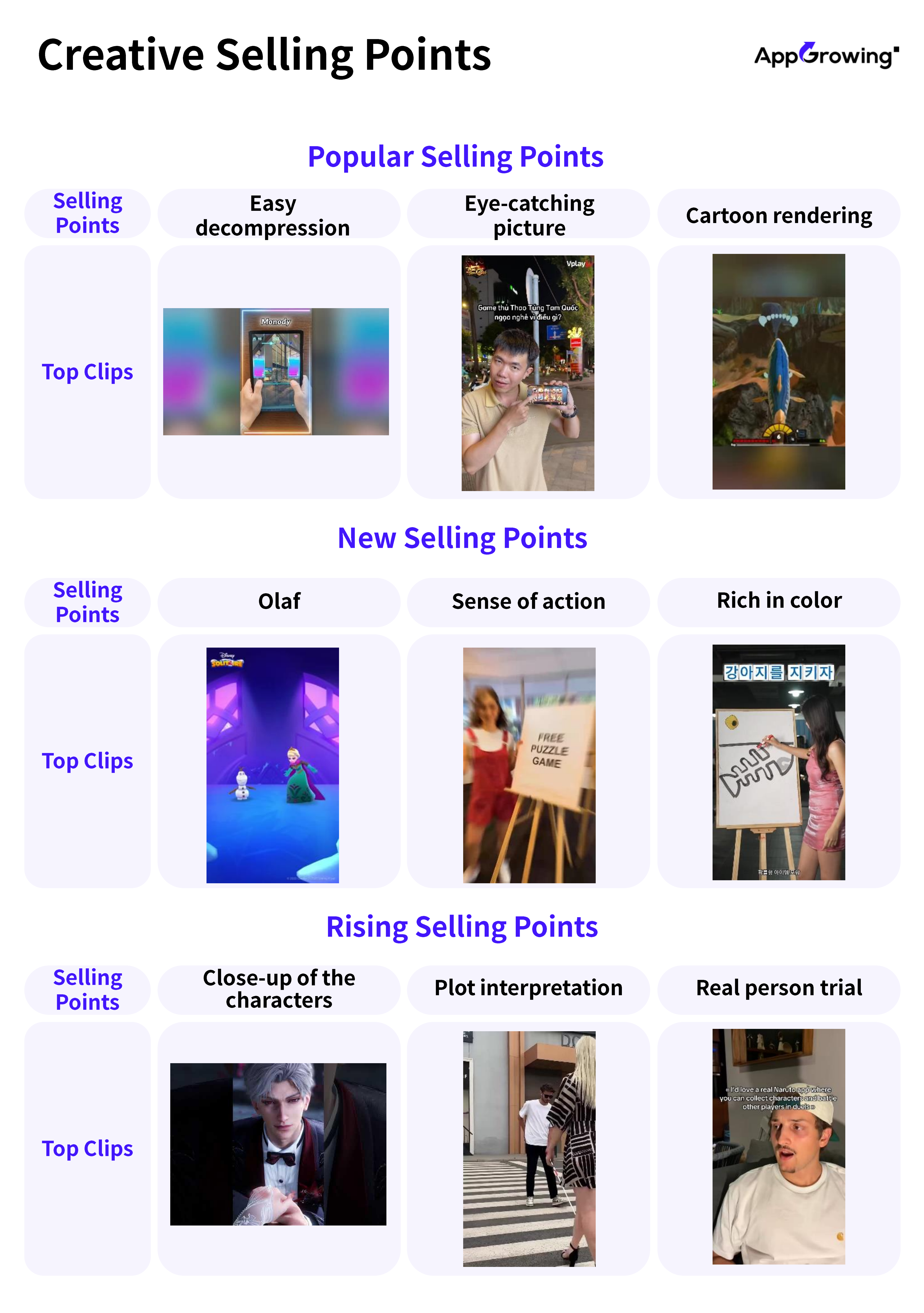 - Popular selling points largely focus on game content and experiential elements, such as easy decompression, eye-catching picture, and using cartoon rendering to enhance visual polish.