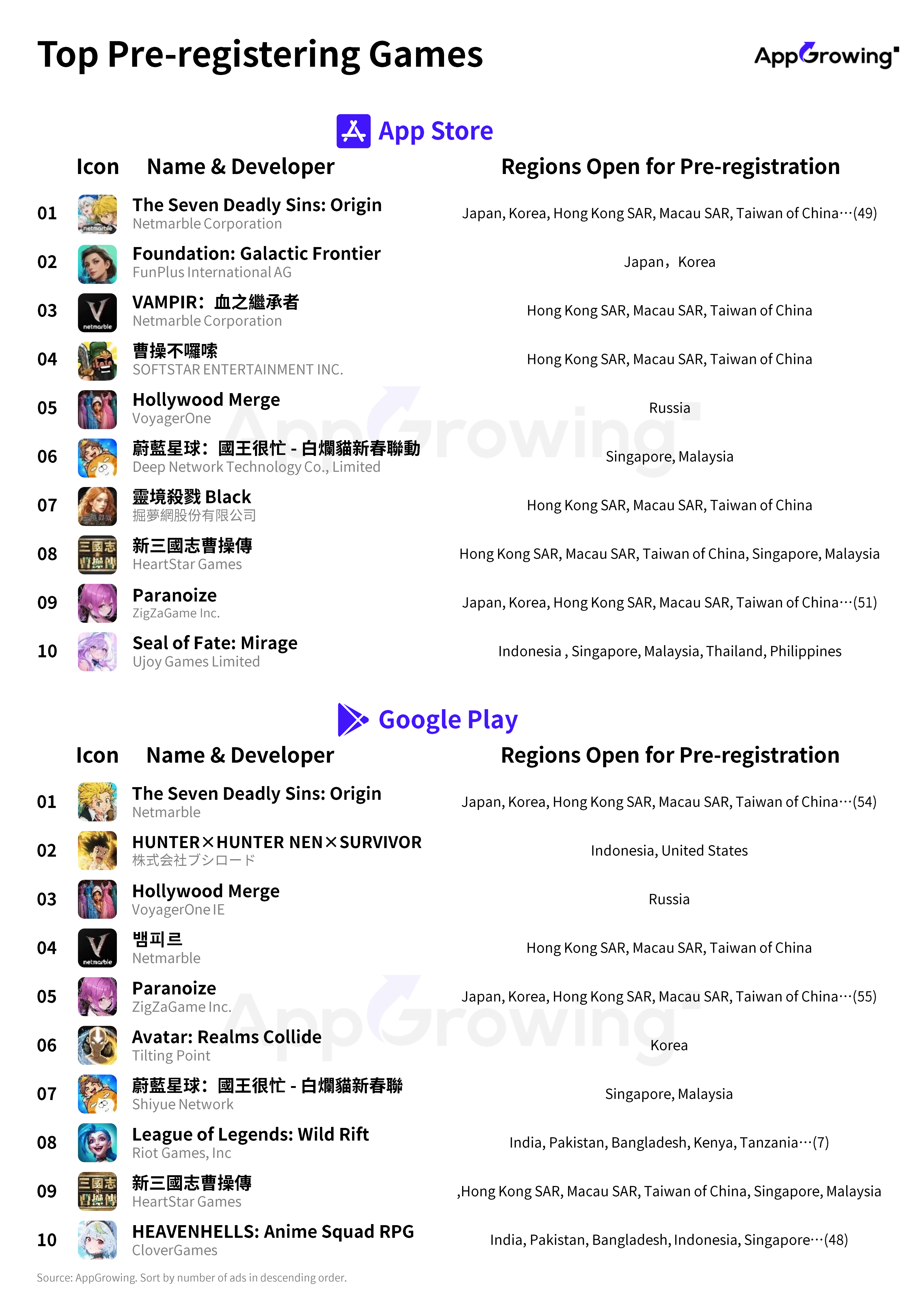 In this period, Netmarble's The Seven Deadly Sins: Origin topped the pre-registration charts on both platforms; The game is an open-world RPG spin-off based on The Seven Deadly Sins IP.