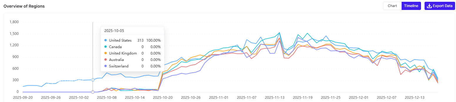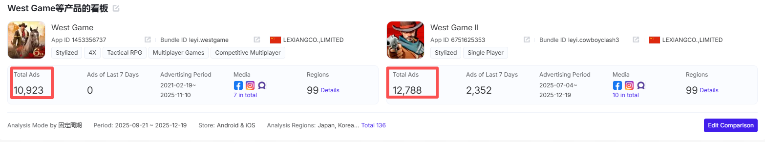 Analyzing the timeline of ad placements, "West Game II" first launched in the United States, and after validating the product's user engagement and monetization model, gradually and systematically expanded its coverage to other European and American markets.