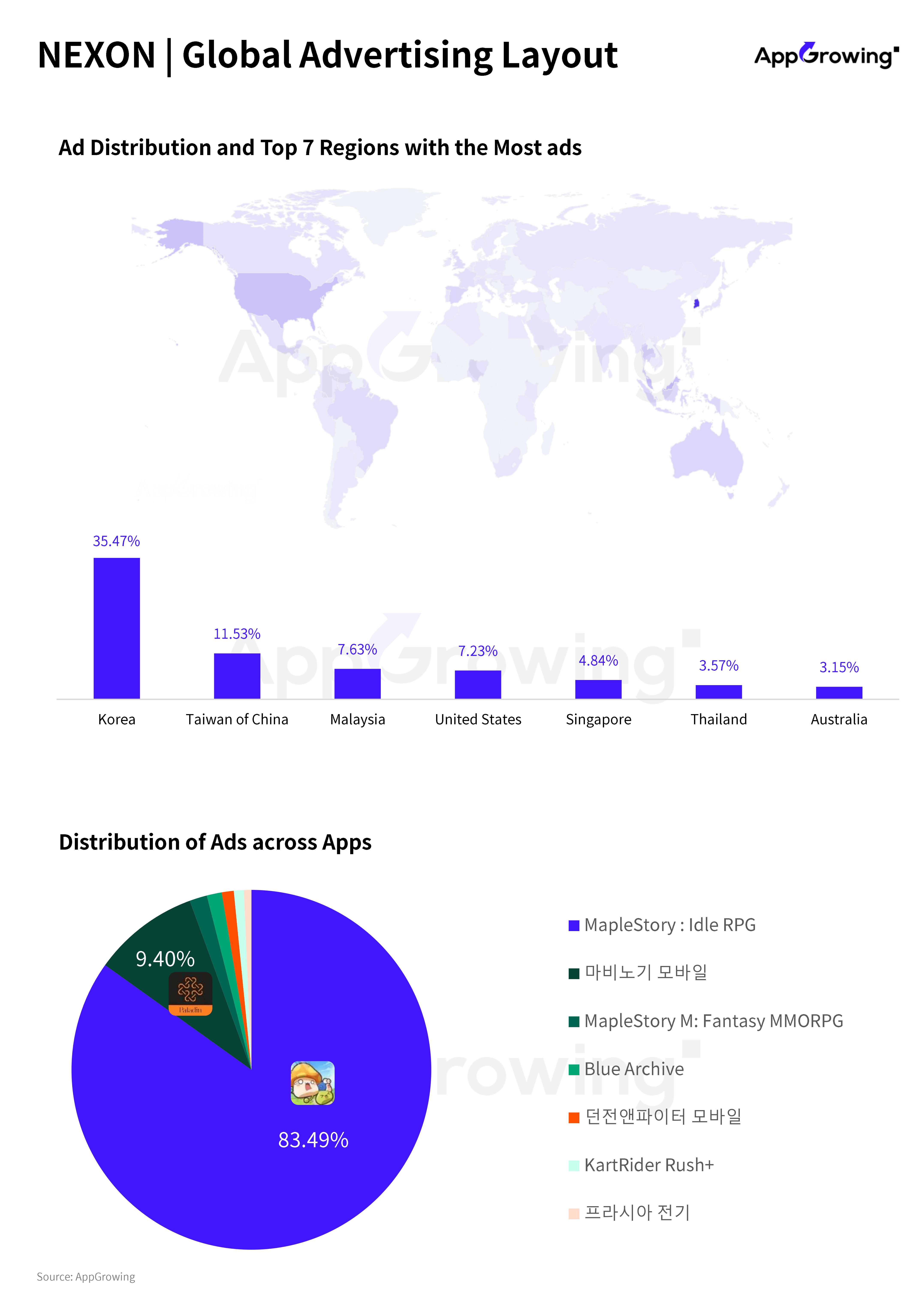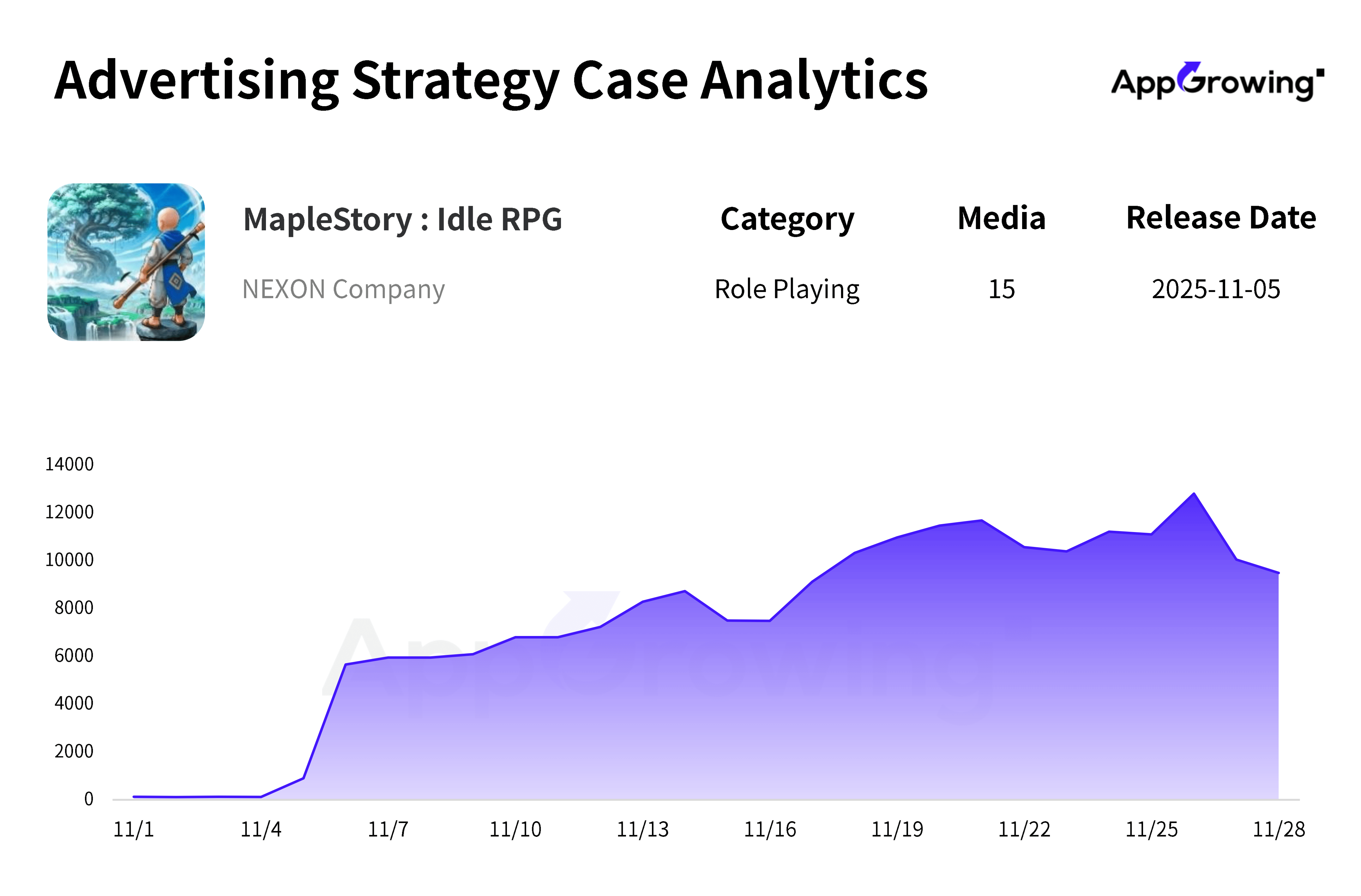 Based on the "Top Publishers" feature of AppGrowing, it is evident that in November, most of Nexon's product budget was directed towards "MapleStory: Idle RPG," with ad volume accounting for over 80%. The top three regions for ad volume are Korea, Taiwan, and Malaysia, which are also the key markets for this new MapleStory IP release.