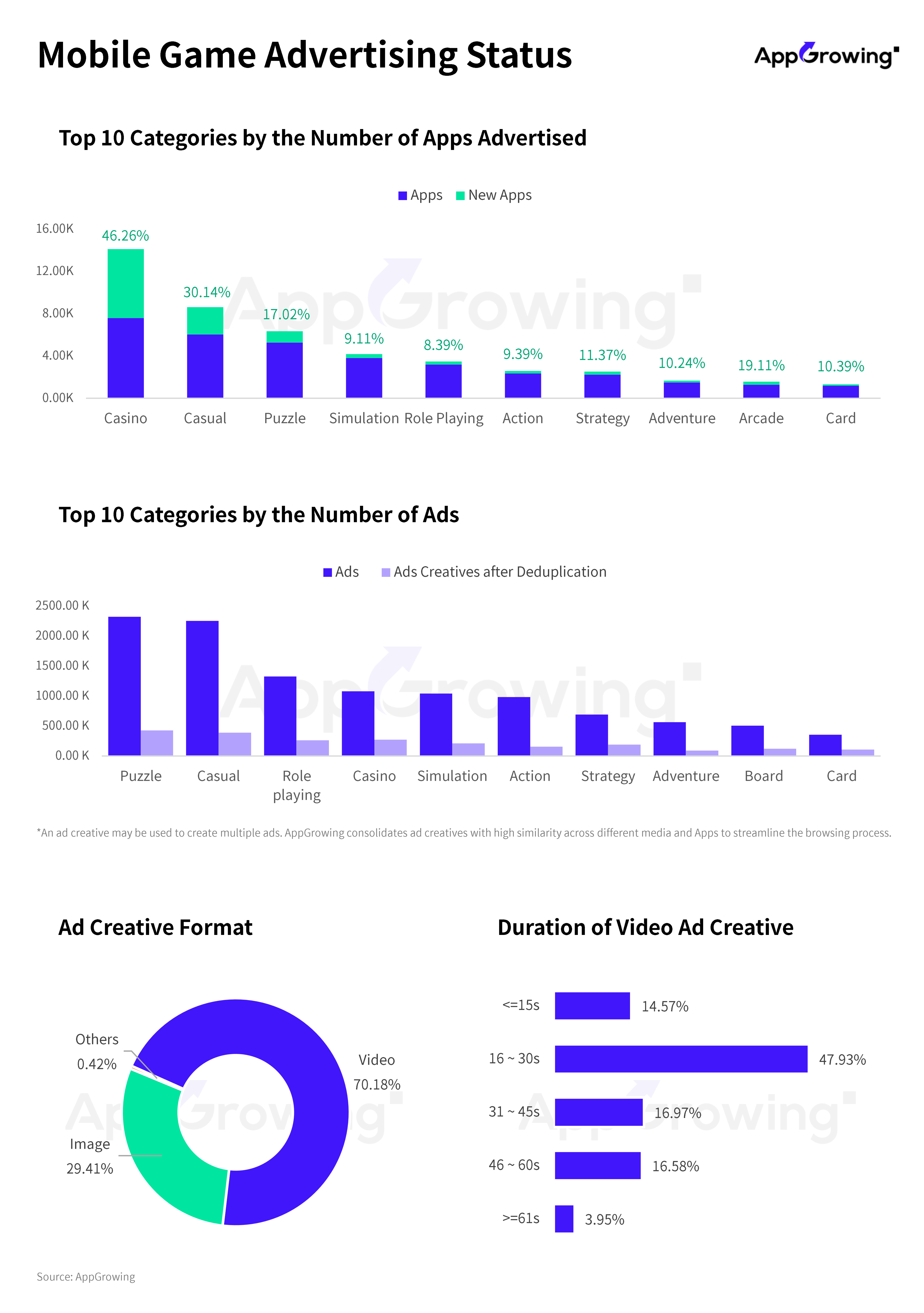 The top three in advertising volume are puzzle, casual, and role-playing games. However, when considering creative material count after de-duplication, casino games surpass role-playing titles.