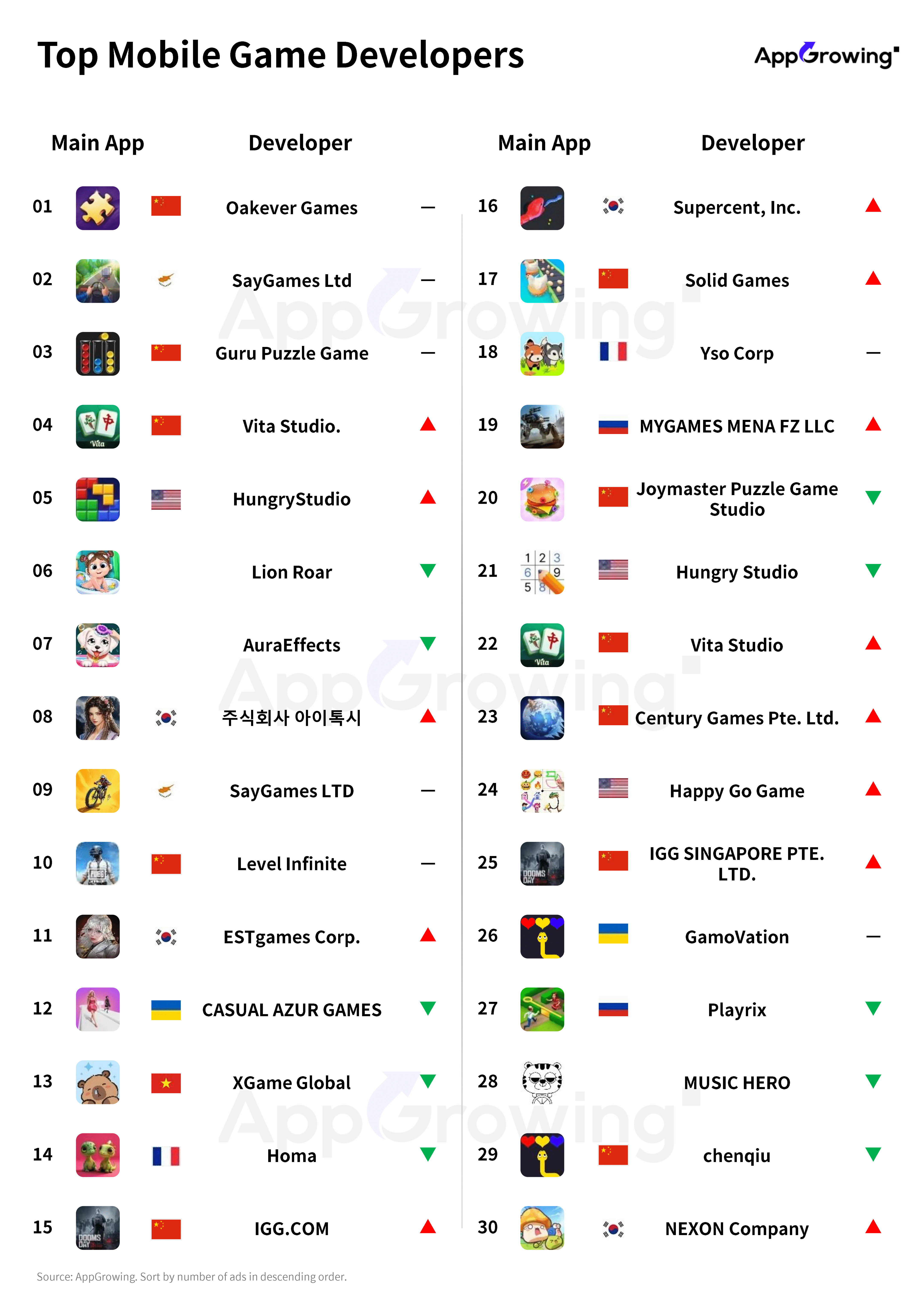 Additionally, Korean developers showed significant momentum in this period, with 3 Korean developers making it into the top 30 for advertising: No. 8 주식회사 아이톡시 (ITOXI), No. 16 Supercent, Inc., and No. 30 NEXON Company.
