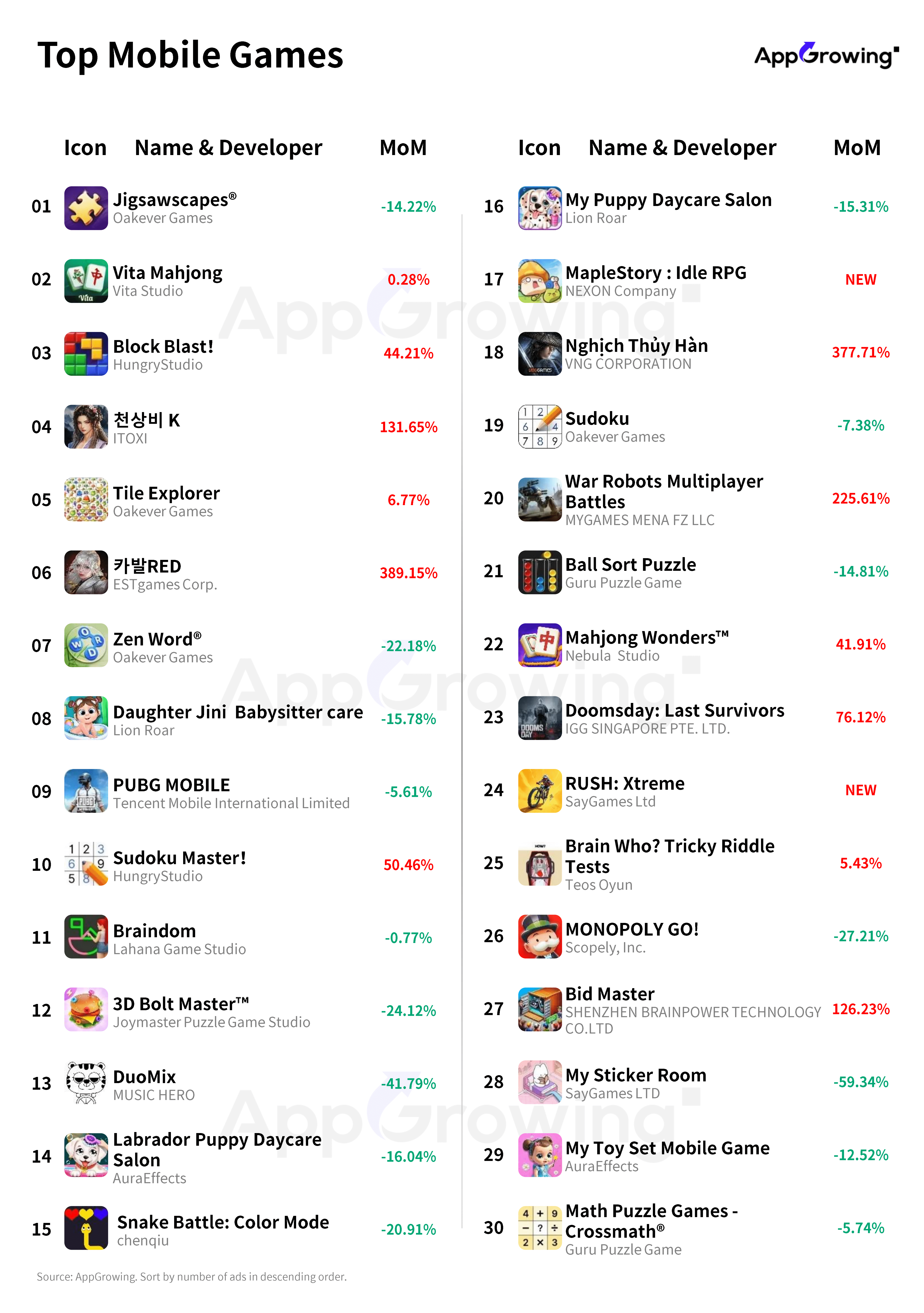 According to AppGrowing, the top three developers in the mobile game developer advertising rankings were Oakever Games, SayGames Ltd, and Guru Puzzle Game, maintaining the same rankings as the previous period.