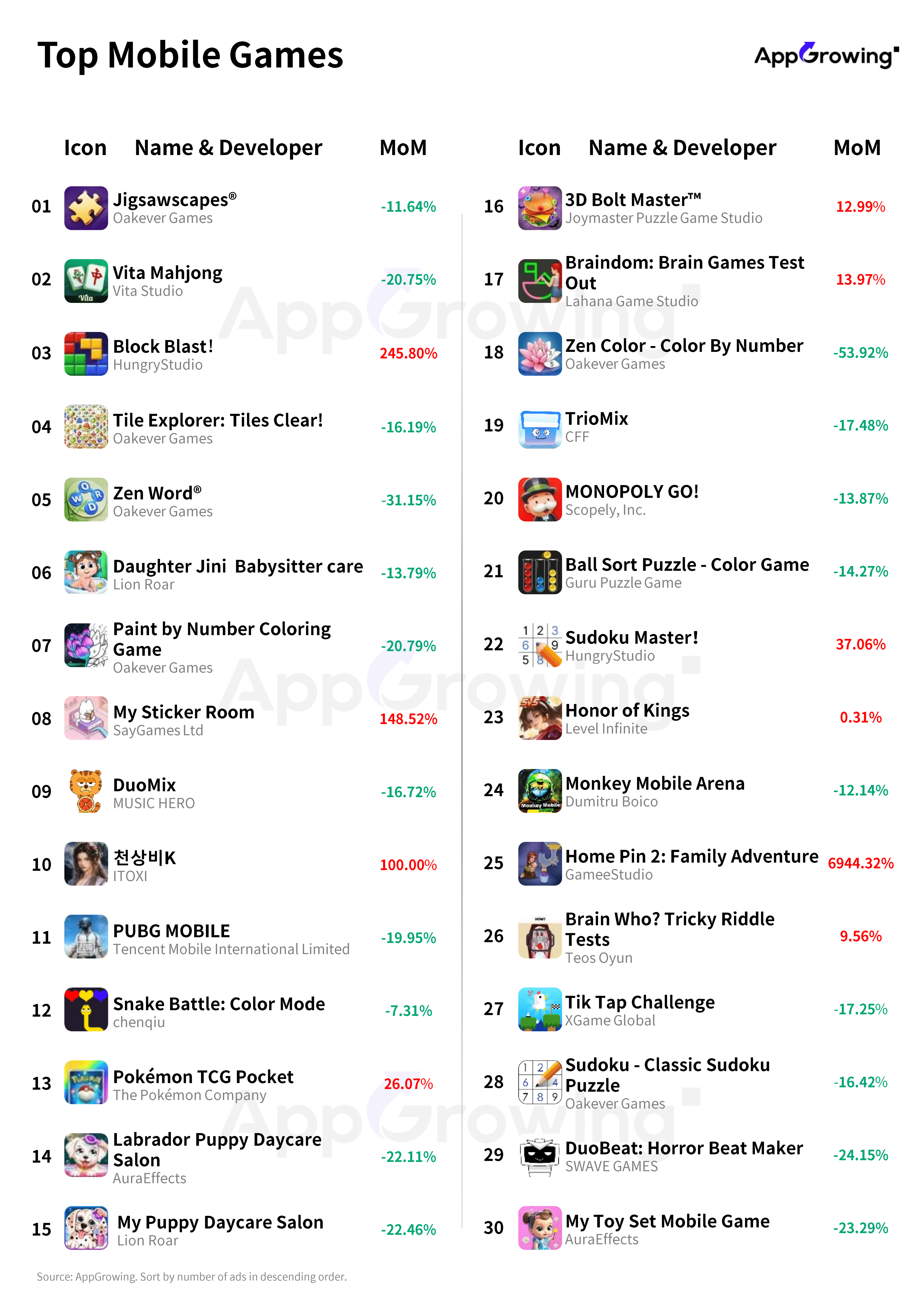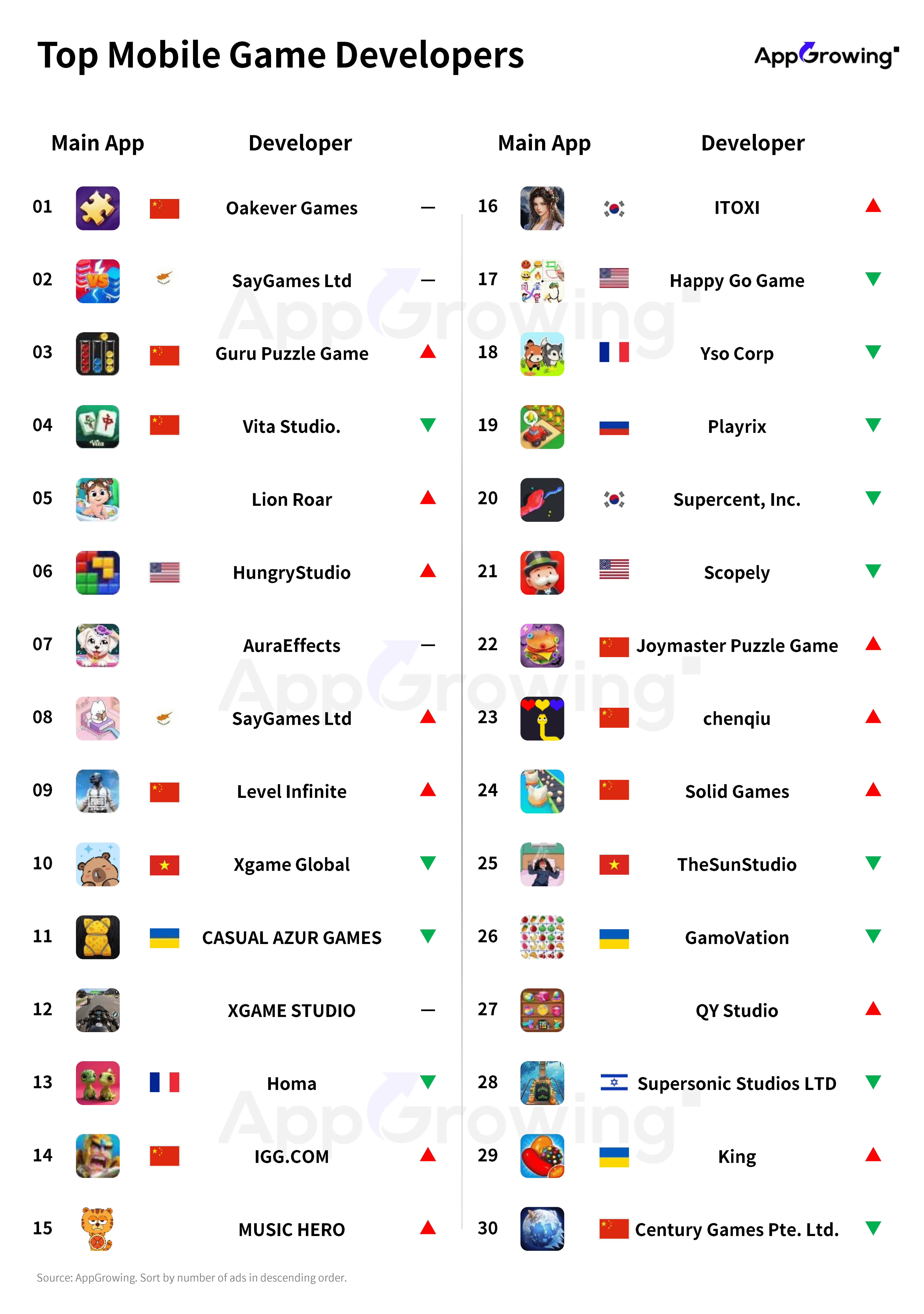 According to AppGrowing, Oakever Games continued to top the mobile game developer advertising rankings in October,