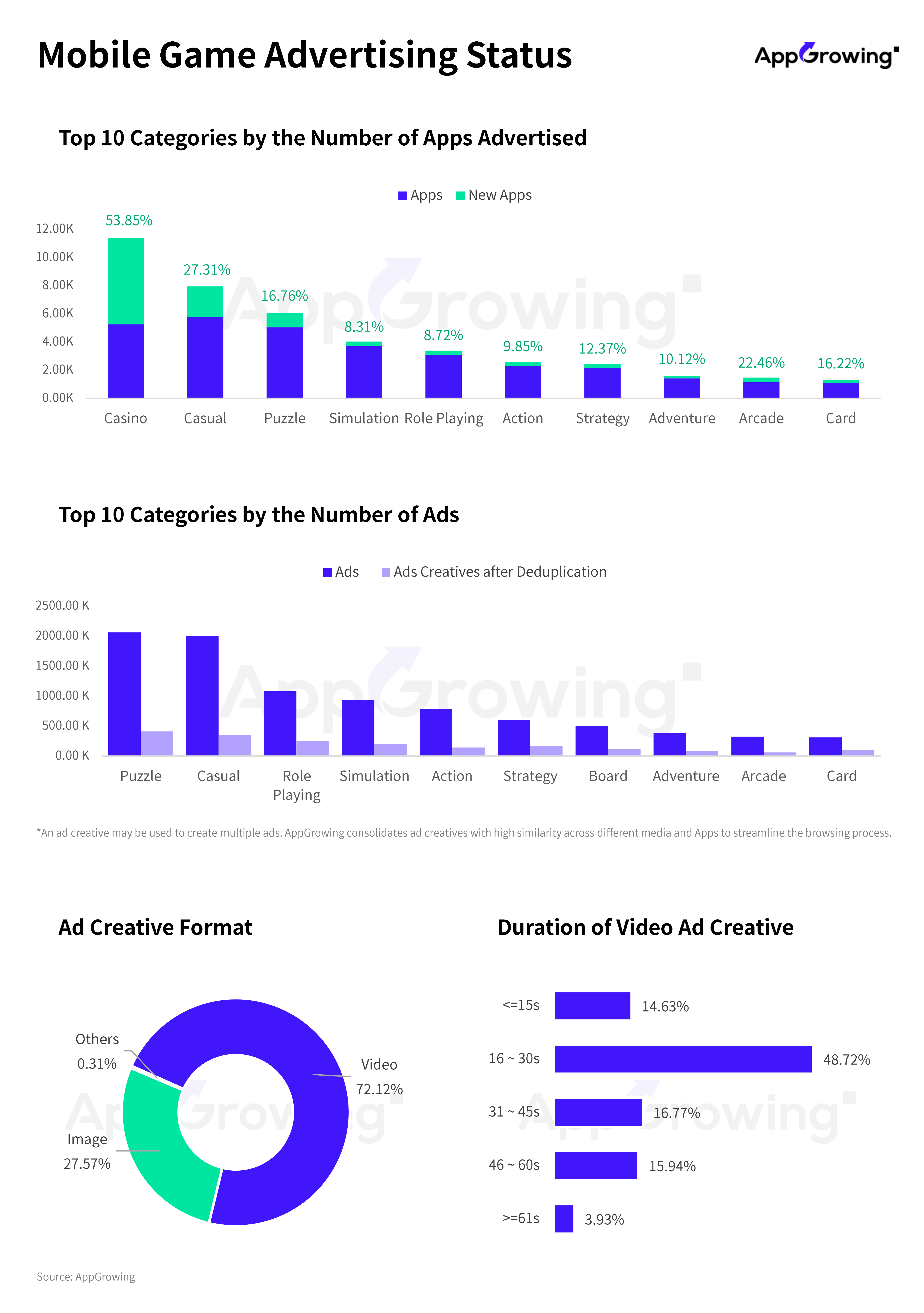 The top three in advertising volume are puzzle, casual, and role-playing games. However, when considering creative material count after de-duplication, strategy games surpass action titles.