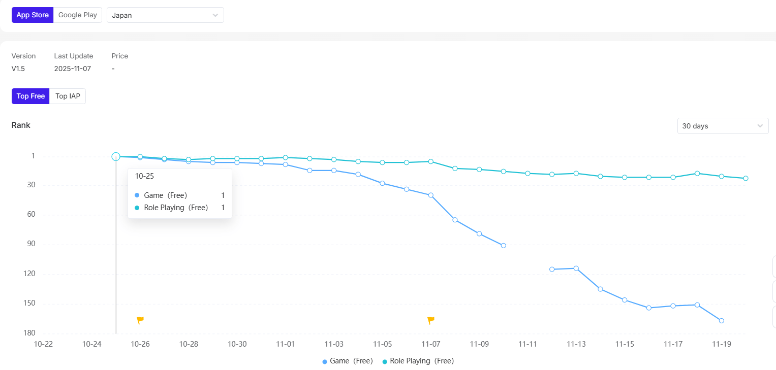 According to AppGrowing, Efun Game’s RPG "百花ランブル" launched in Japan on October 23 and quickly topped the local iOS free chart within two days.