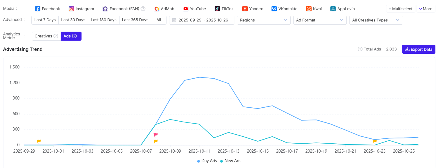 According to AppGrowing, 'Trickcal: Chibi Go' initially launched with a maximum of 1,312 ad creatives within the first few days. Currently, daily ad spend does not exceed 100 creatives. However, it is worth noting that although the game's paid promotion is quite moderate, the content is meticulously crafted, emphasizing a “less but high-quality” strategy.