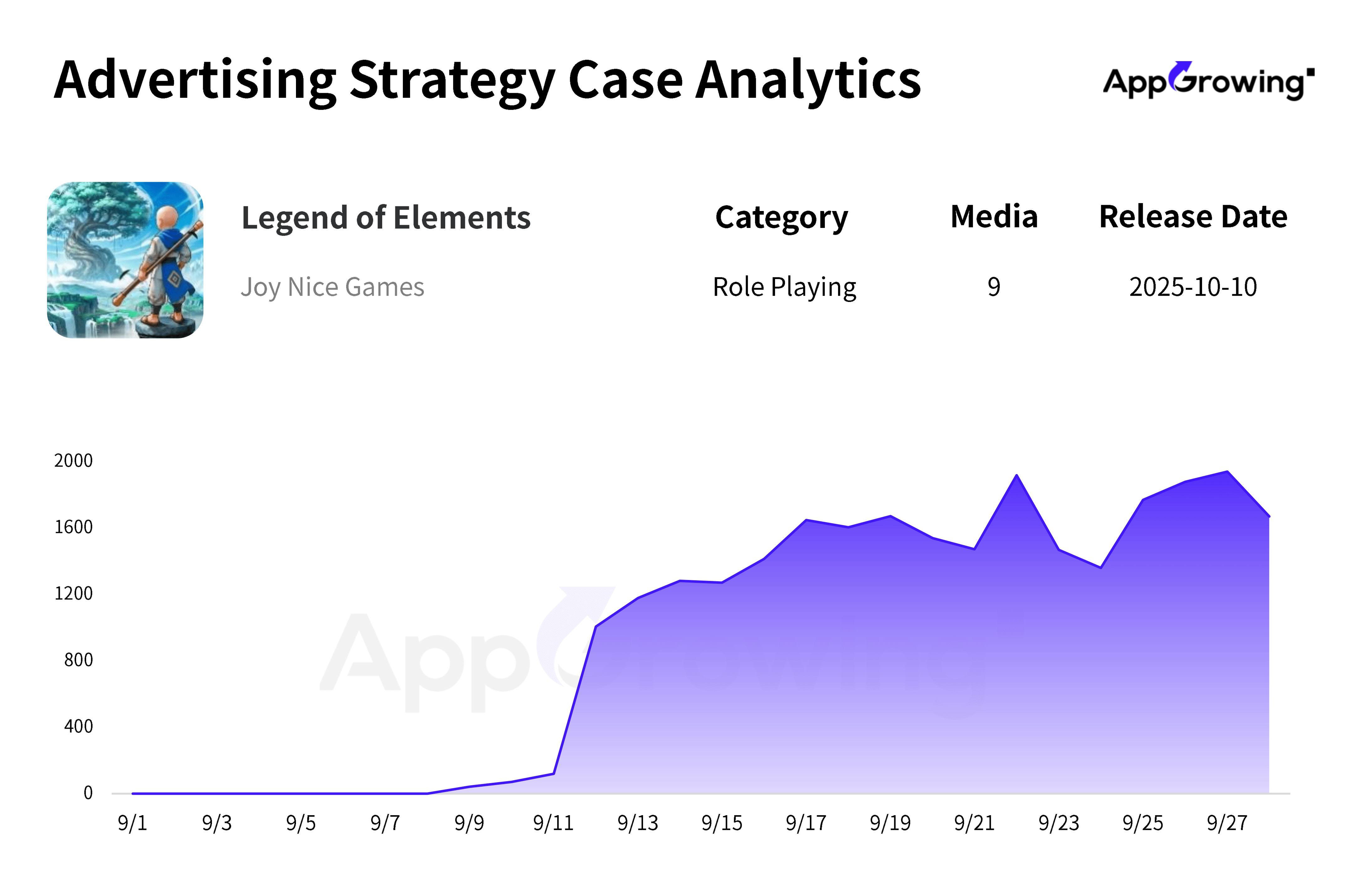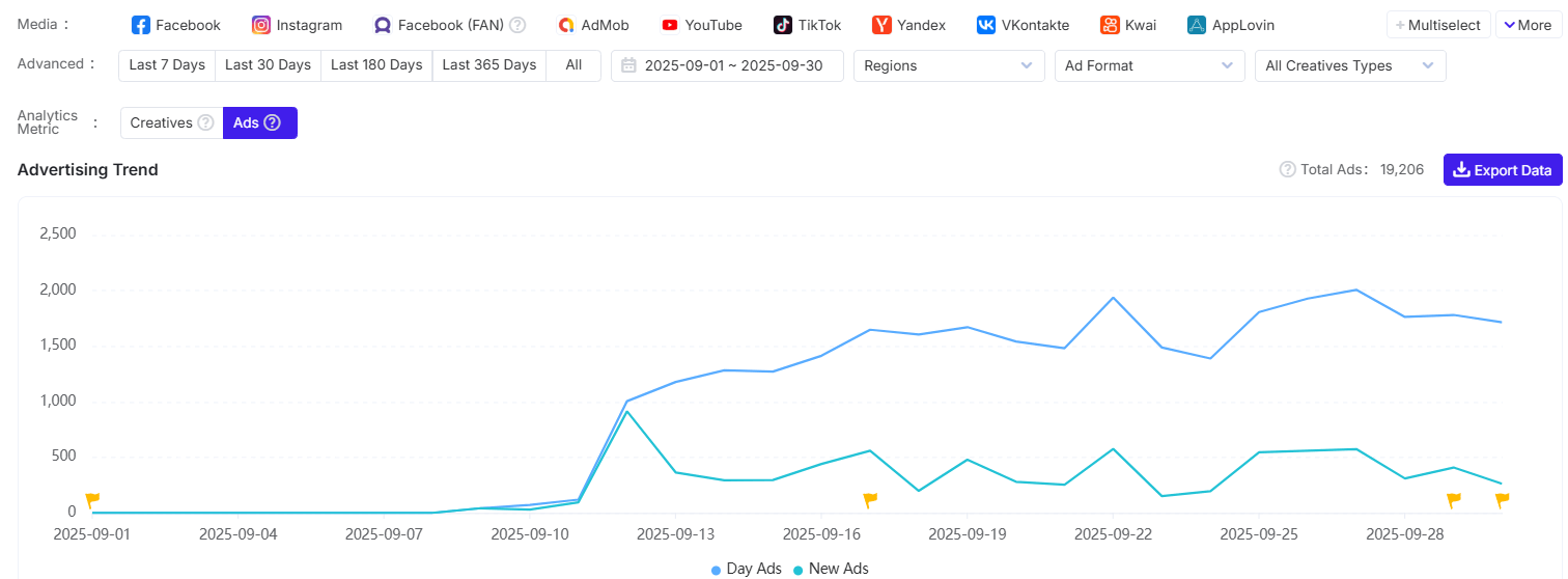 Focusing specifically on the advertising strategy for "Legend of Elements," data from AppGrowing shows that the game increased its ad spend starting from September 12, with daily ad volumes generally exceeding 1,000 sets.
