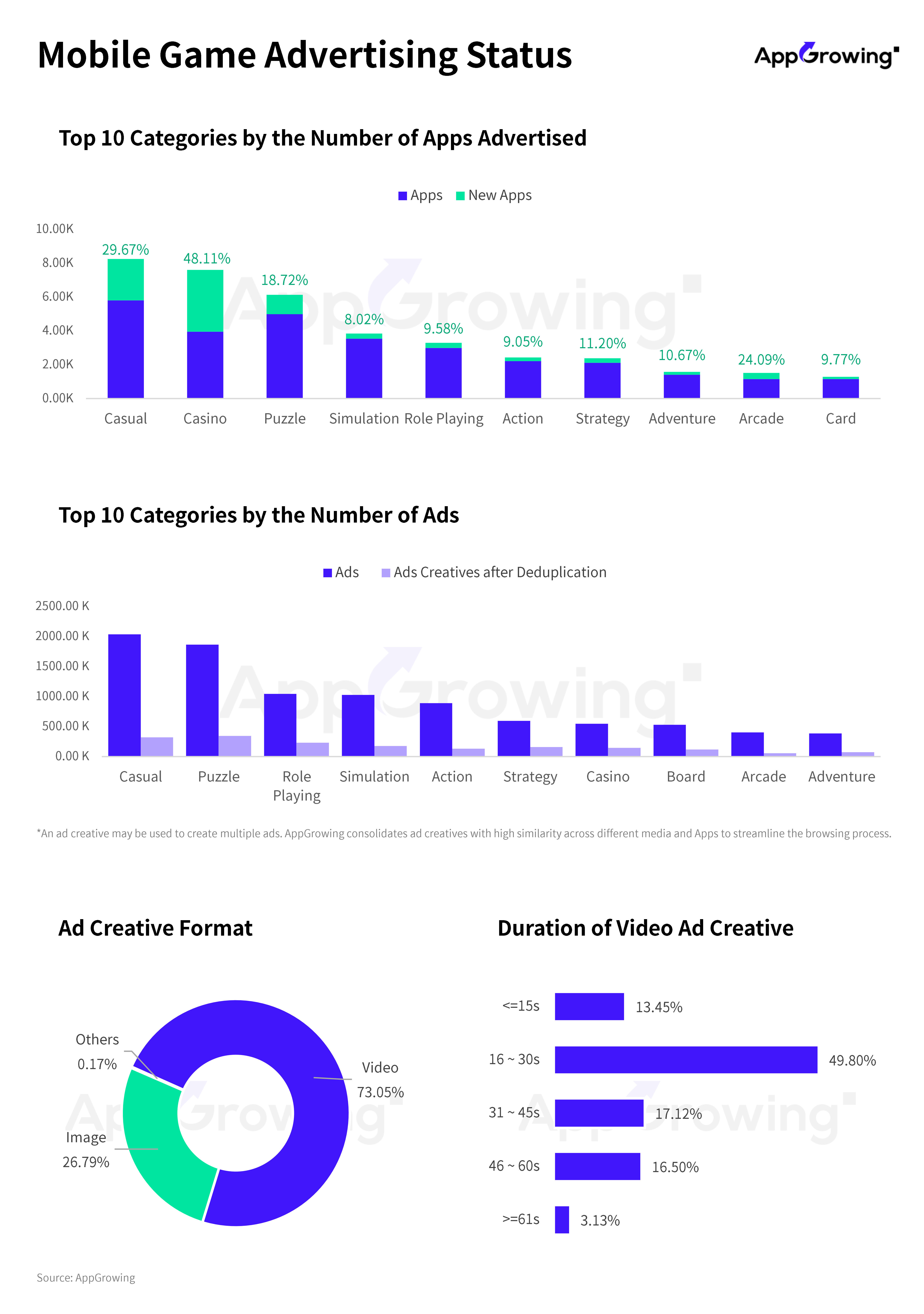The top three in advertising volume are casual, puzzle, and role-playing games. However, when considering creative material count after de-duplication, puzzle games surpass casual titles.