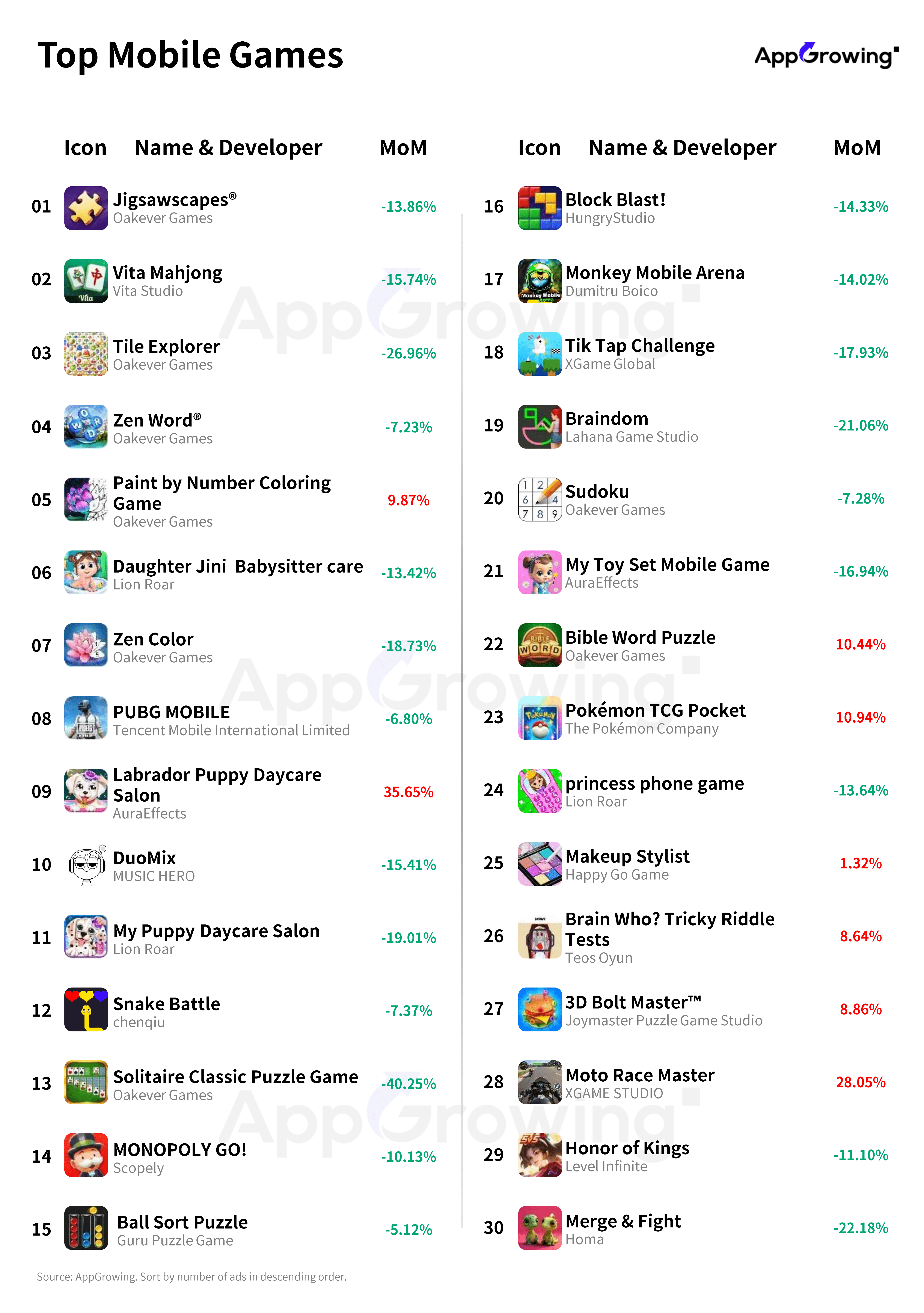 The advertising volume change for the featured games in this period can be almost entirely described as "green," indicating reductions. The most significant decrease is seen with Oakever Games’ "Solitaire Classic Puzzle Game," which dropped by 40.25%. Most other titles decreased by less than 20%.