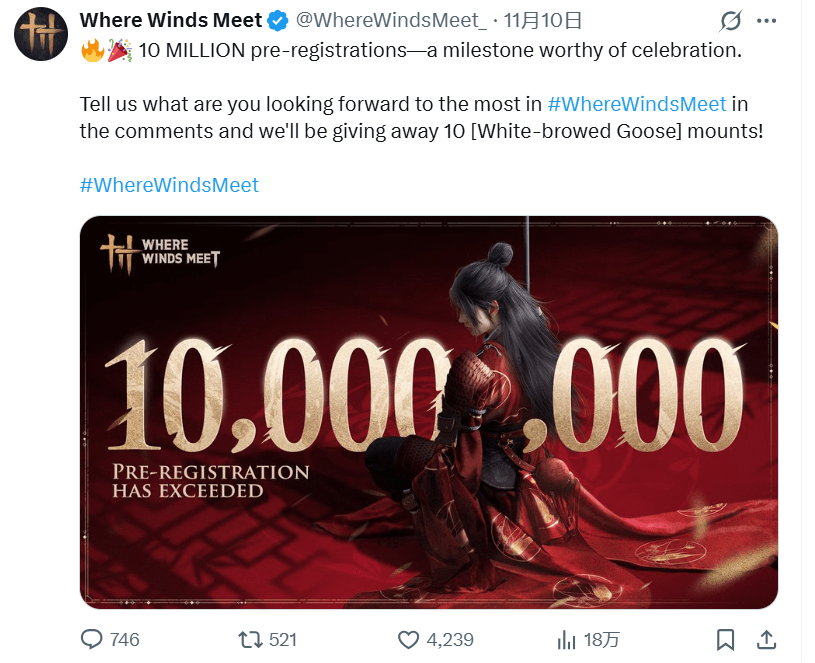 Notably, based on AppGrowing, Where Winds Meet is also scheduled to launch on November 14, 2025. The sequential release of two similar-themed products is expected to lower the cultural comprehension cost for international audiences and promote mutual support. Currently, Where Winds Meet is also gaining attention, with over ten million overseas reservations.