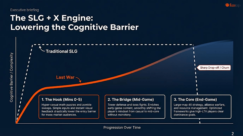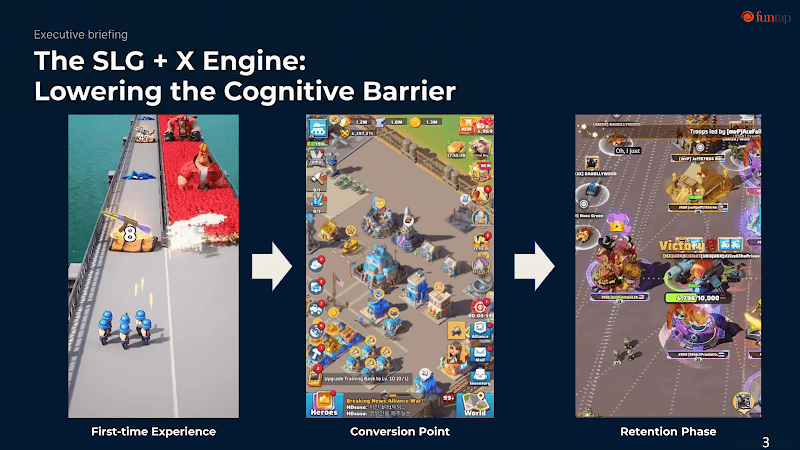 In the early stage (0–5 seconds), the game uses hyper-casual sub-gameplay such as “choice-based gate-running” as an entry point. The simple control mechanics and instant visual feedback significantly lower the perceived barrier for users. In the mid stage, tower defense and boss battles are gradually introduced, shifting players’ attention toward mid-core gameplay. Only after this does the game unlock core SLG mechanics such as 4X marching systems.