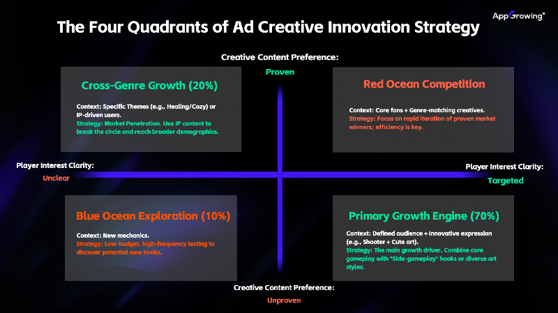 This logic is consistent with the “The Four Quadrants of Ad Creative Innovation Strategy” proposed by AppGrowing.