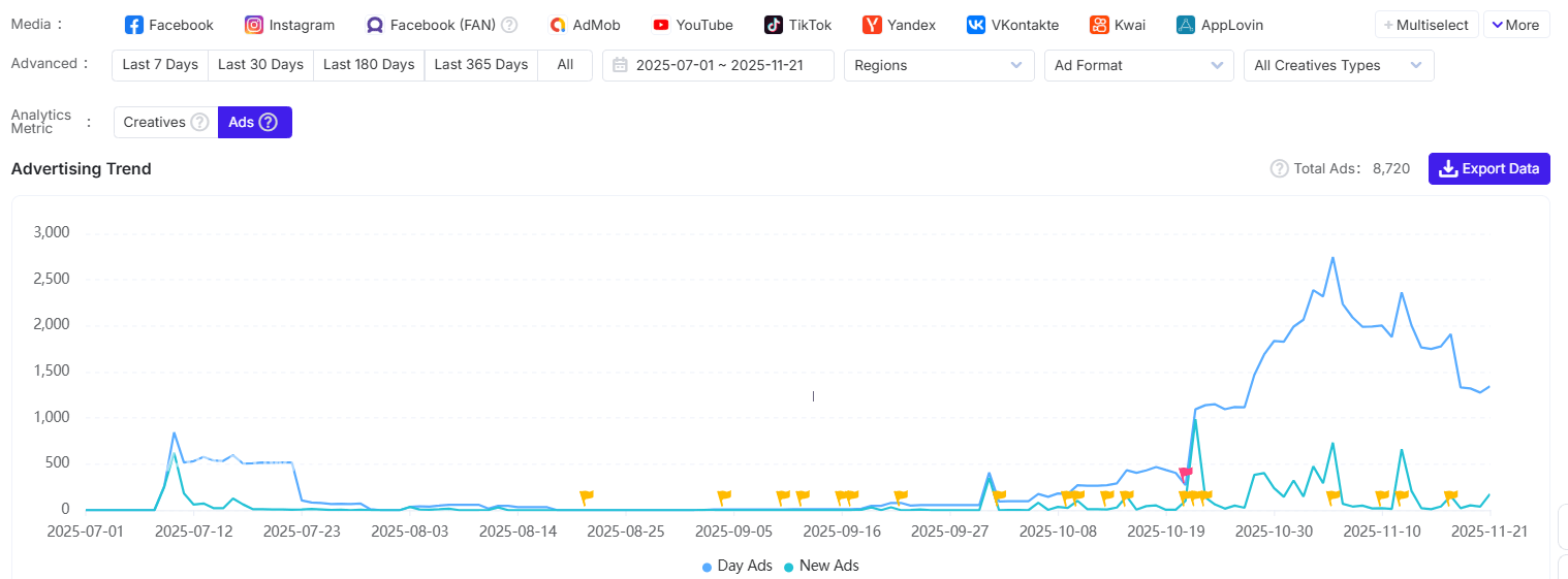 After the launch, the game significantly increased its ad placement, with daily placements approaching 3,000 during peak periods. Additionally, it ramped up promotional efforts during content updates to sustain player engagement and maintain momentum.