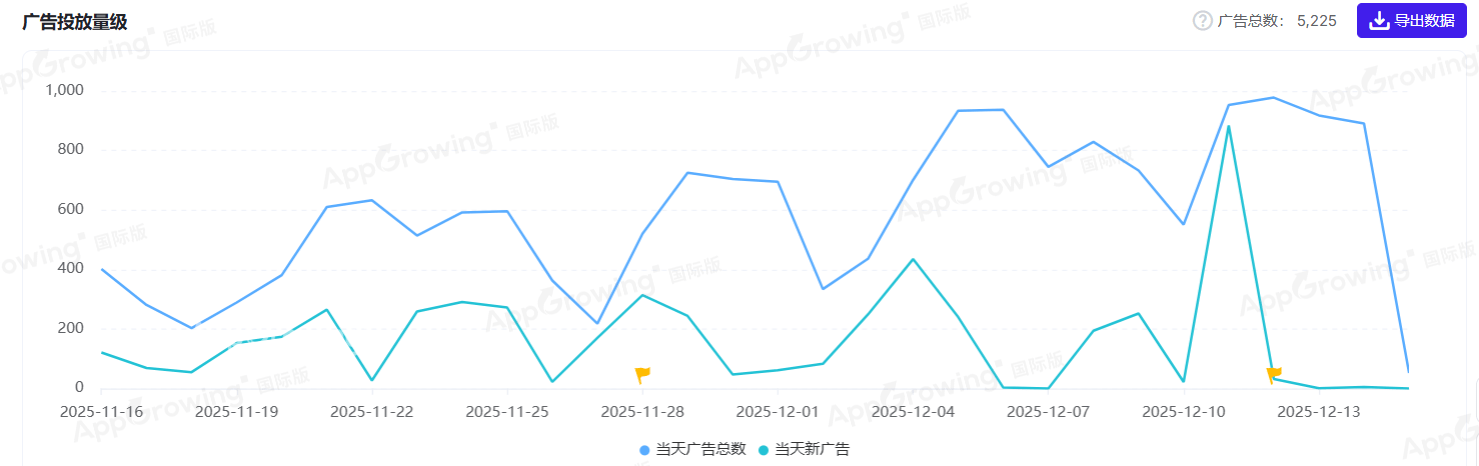 从 2025-11-16 到 2025-12-15 的近一个月时间内,Hero Clash 共投放 5,225 条广告,其中单日广告量峰值达到 978 条(2025-12-12)。这一时间点高度可能对应应用商店冲榜、版本推广或阶段性变现测试。