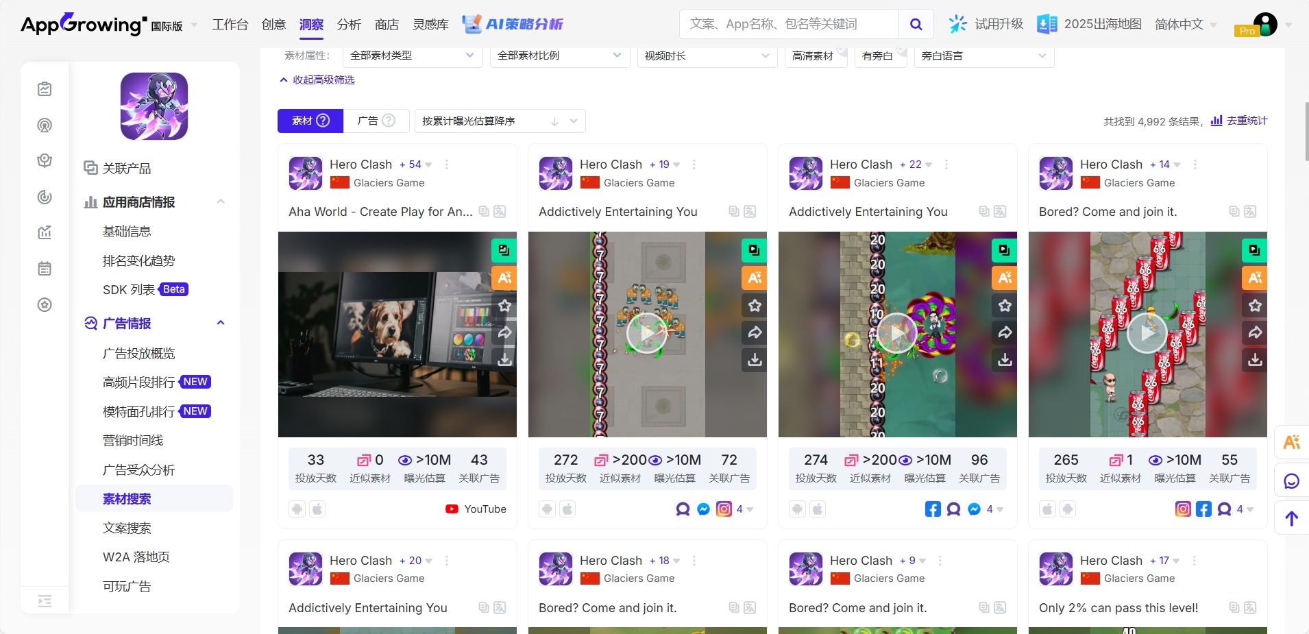 对于希望进入海外市场的休闲游戏厂商而言,Hero Clash 的案例再次证明:投放规模、素材结构与平台选择并非孤立决策,而是围绕算法、用户习惯与产品生命周期协同优化的结果。借助 AppGrowing 这类全球广告策略分析平台,营销团队可以更高效地洞察竞品投放节奏,减少试错成本。