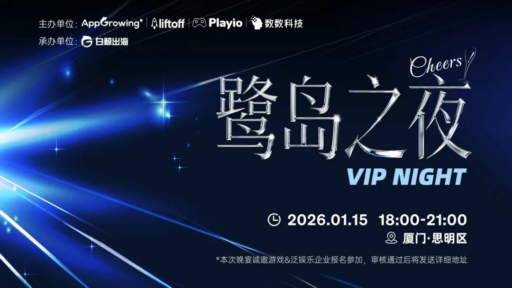 2026 年 1 月 15 日, 由 AppGrowing、 Liftoff、Playio、数数科技 联合主办,白鲸出海承办的“鹭岛之夜”私享晚宴,将在厦门思明区举行。